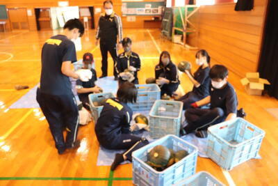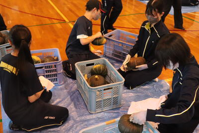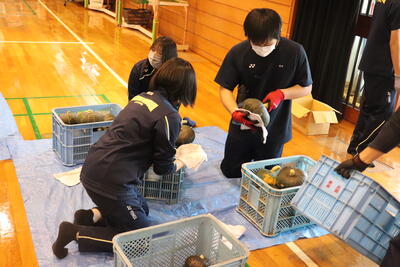 収穫したカボチャは、体育館で綺麗に拭きます。
