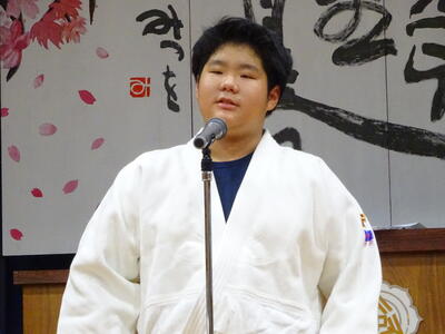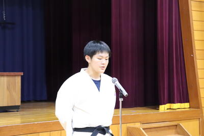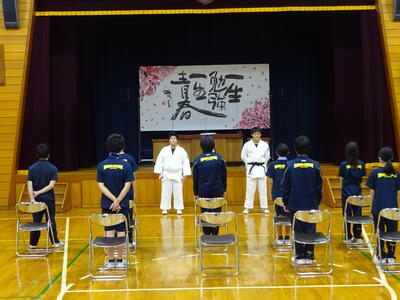 明日は中体連の管内大会です。本校からは柔道に2名出場します。練習の成果が発揮して目標を達成できるようみんなで激励の校歌を歌いました。