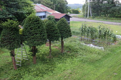 左の写真は教室から撮影した模様です。すごい勢いで成長している農作物のほかに、木の剪定をされている方が写っています。業務技師さんと地域の方が夏の暑い間に一生懸命刈ってくれました。
