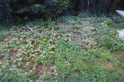 左の2枚目の写真は、かぼちゃの生育状況です。