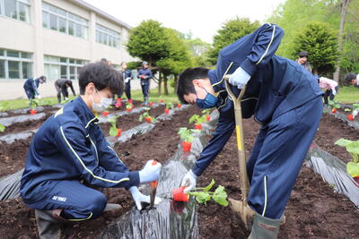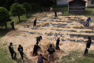 栽培にあたって、元肥・土おこし作業、雑草防止の麦わらまきなどは地域・保護者の協力も得ています。