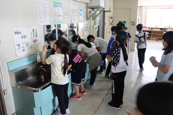 その後,当番児童が先に手洗いをします。配膳を早めるためです。