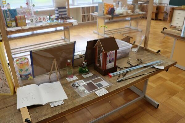 図工室を会場に,各学級から代表作品が8点ずつ出展されています。