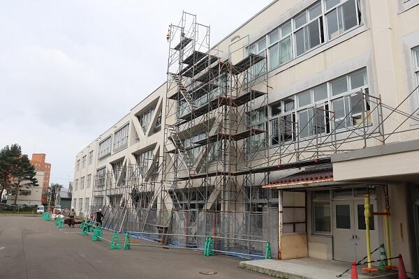 校舎外では,外壁工事が始まりました。今後,防水工事や塗装などの作業が行われます。