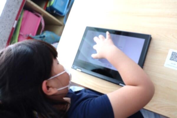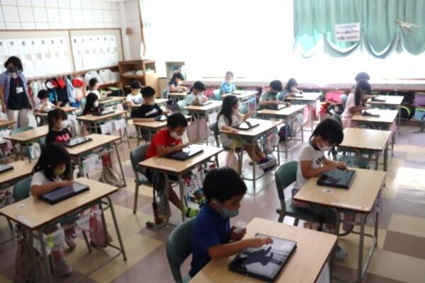食い入るように端末の画面や音声に集中しながら学習に取り組む子供たち。