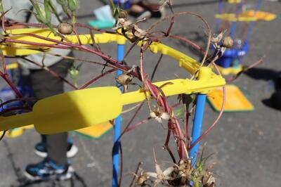晴れ渡る空の下、1年生が外でアサガオの種を取っていました。