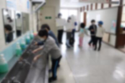 昨日と今日の中休み、保健委員が各手洗い場で手洗いの呼びかけ活動をしました。
