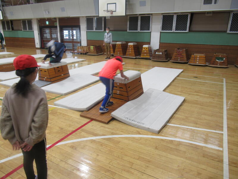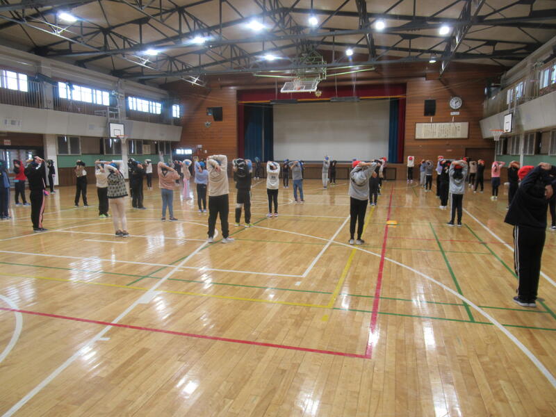 台上前転を練習する4年生のみなさんです。まずはしっかり準備運動。