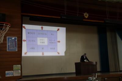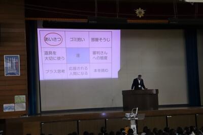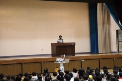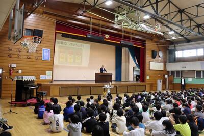 始業式では、校長先生が、大谷翔平選手の取組を例に挙げ、目標に向かって挑戦する大切さを子供たちに伝えました。