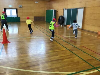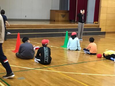 午後には、小学校は、新体育館でみんなで鬼ごっこをしました。