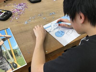 同じく午後、中学校では、美術で版画を彫ったり貼り絵をしたりしました。
