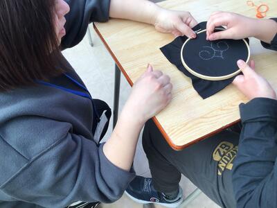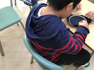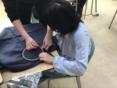今日は、小学校では布にアイヌ文様の刺繍をしました。