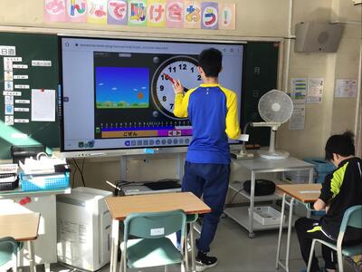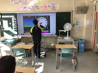 (午前)10時56分や20時32分などを、電子黒板上の時計を操作しながら示します。