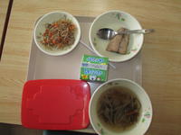 中学生は小学部の全学級が配膳室から給食を運び終えた後、給食を取りに来ます。さすがに慣れていて、すぐに2階の教室へ運び、自分の分を用意したら、「いただきます。」をして食べ始めます。先生方に話を聞くと、麺類やカレーの日はかなりよい食べっぷりだそうです。
