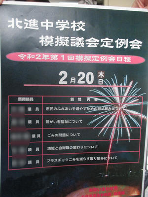 代表して5名の生徒が質問しました。「市民のふれあいを増やす取組」「障がい者の福祉」「ゴミの問題」「地域と自衛隊のかかわりについて」「プラスチックゴミを減らす取組」がその内容です。理事者役の市議や議会事務局の方々にそれぞれ礼をして、登壇前に議長に礼をして…など貴重な経験をしました。
