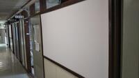 先日、体育館へ向かう1階廊下の壁の塗装をしてくださいましたが、本日、掲示板のクロスを張り替えていただきました。