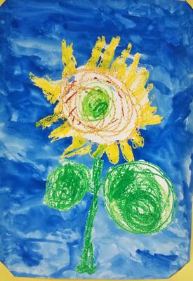 小学校の農園の端に植えていたひまわりの花を描いた作品です。