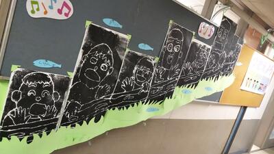 小学校高学年の教室前に図工の時間に取り組んだ版画作品が掲示されました。題材は「ぞうきんがけ」です。