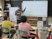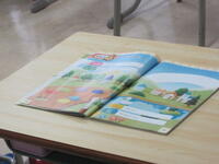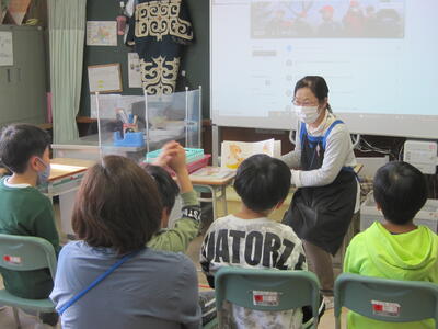 高学年の子どもたちは、担任とALTの指導で公園の絵の中から英単語を学ぶ学習をしていました。発音をまねたりしながら、楽しそうに授業の臨んでいました。