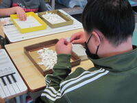 軽作業、縫合、木工の3グループに分かれて行っている作業学習。とのグループも担当教員やヘルパーの指示を聞きながら一生懸命に取り組んでいます。集中力、手指の動きの向上などに向けて一生懸命に頑張っています。