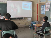 その後、署員さんから全校児童生徒を対象に「いかのおすし」について紙芝居で説明していただき、中学生のみを対象にインターネット利用の注意事項についてお話いただきました。