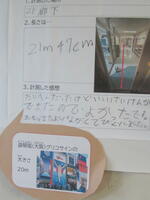 中学校の掲示板に数学の学習の成果をまとめた掲示物が貼られています。教室でものの長さについて学習したあとに、校舎をまわって具体物の長さを測る姿をしばしば見かけましたが、その結果をほかのいろいろなものの長さと比較しながら、イメージしやすくする工夫が見られました。
