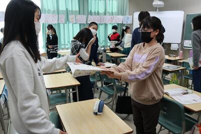 6年生の教室では、2人組で証書授与の練習をしていました。背筋を伸ばして、よい姿勢で受け取っていますね。