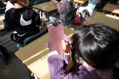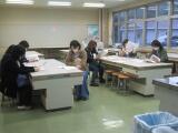 1年生は、画用紙を切って、卒業のお祝いのメッセージを書く桜を作っていました。