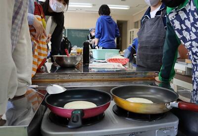 卒業祝いも兼ねて、ホットケーキを作っています。6年生にとっては、久しぶりの調理実習でしたが、協力して楽しく活動することができました。とてもおいしくできました。