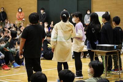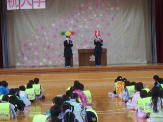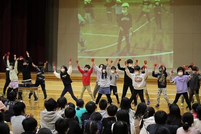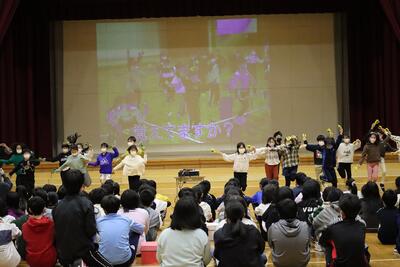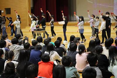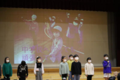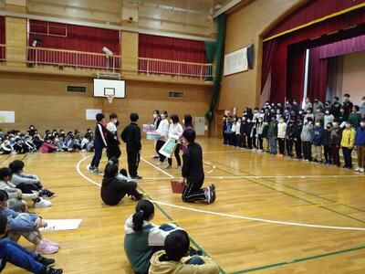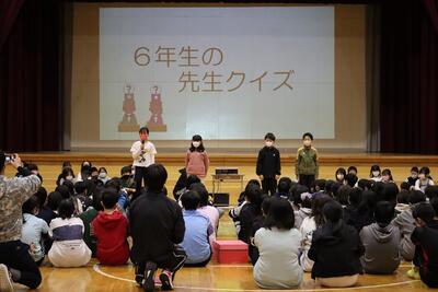 6年生の卒業をお祝いして、在校生から、歌や踊り、プレゼント、クイズなど楽しい発表がありました。最後に、6年生から、呼びかけとプレゼントのお返しがあり、在校生とお世話になった先生方への感謝の気持ちを伝えていました。