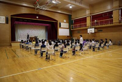 ステージにはバック幕が設置され、体育館にパイプ椅子が並びました。今日から、体育館を使った卒業式練習がスタートしました。少し緊張気味の様子の6年生でした。