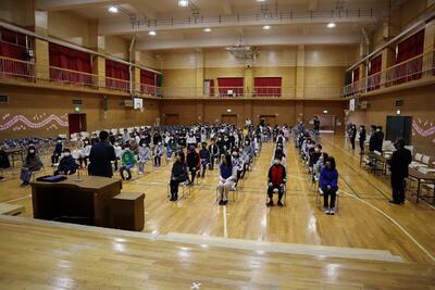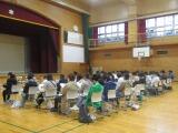 ひまわり学級、あすなろ学級、2組、3組の児童が体育館で卒業式練習を行っています。本番同様に、真剣な表情で取り組んでいる6年生です。