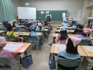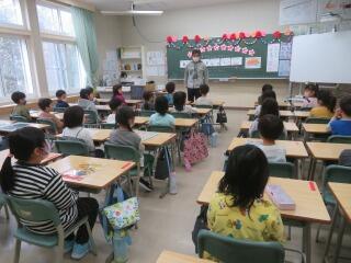 毎朝、6年生が交代で1年生の教室に行き、朝の準備を手伝ってくれたり、はげみタイムの時間を使って1年生を楽しませる色々な工夫をしてくれています。お世話の様子を見ていると、やさしい言葉で教えてあげたり、1年生の目線まで低くなって話している姿が見られました。そして、今日はクイズを出してあげているクラスが多く、とても盛り上がっていました。