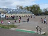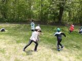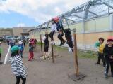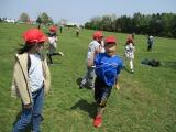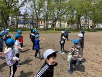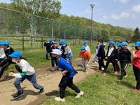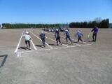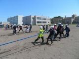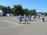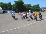 棒を4人で持ちながら走るのですが、コーンを回るところをうまく回ることができるかどうか、そして難しいのは、クラスで並んでいるところを、棒を足の下にくぐらせるので、皆がタイミングよくジャンプしなければならないところと、足の下をくぐらせた後、今度は皆の頭の上を通すので、しゃがまなければいけません。この動きがタイミングがずれると棒にひっかかったりして遅くなります。チームワークの見せ所となるわけです。今日は、前回よりもずっと上達していました。さすが4年生、この調子で団結力を高めていきましょう!