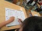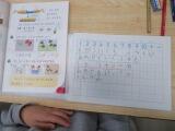 1年生の算数は、数の構成や順序の学習を終え、今は「あわせていくつ ふえるといくつ」の足し算の学習を進めています。今日は、初めて「しき」の表し方を覚えました。+や=の書き順もきちんと確認し、みんな丁寧にノートに書いていました。