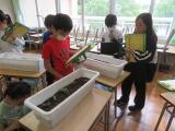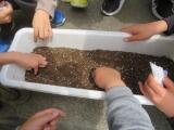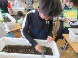 まずは教室で手順を覚えました。それから外に出て、自分の鉢の中に土や肥料を入れて混ぜます。土に6か所ぐらい穴をあけて、そこにそっと種をうえました。みんな大事そうに、ていねいに水をあげていました。