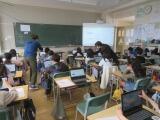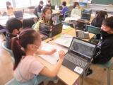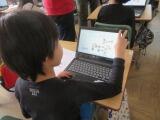 6年生の教室では、卒業作品の『プレミアムBOX』の制作の真っ最中でした。デザインを考え、彫刻刀でほって立体感を出し、最後は絵の具で着色しています。難しいところはグーグルの学年「クラスルーム」にアップされている説明動画で確認しながら作業を進めていました。