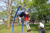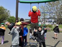 また、ボールなどを投げる経験も少ない子がいることから、投げる練習をするコーナーも作りました。ロープにバトンを通して高いところから吊るし、バトンを持って上に投げる運動です。中休みや昼休みに、使えるクラスの割り当てをしながら交替で使っています。今日も大盛況で、皆さん楽しそうにチャレンジしていました。