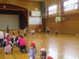 3組と4組がドッジボールの対決をしていました。体のどこにあたってもあまりいたくない柔らかいボールを使っていますので、思い切って投げることができます。同じ子ばかりが投げないようにボールを回したり、お互いに声を掛け合ったりしながら、ゲームを楽しんでいました。