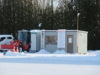 さて、冬休みに入ってからずっと雪が少なく、気温が高い日もあったため、スケートリンクの造成が難しい毎日でしたが、今日の朝、ようやくオープンできる連絡がありました。小屋の前にも白旗が立っています。