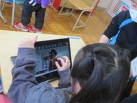 あすなろ4組では、次週の図工の学習に向けて、タブレットを使って写真撮影と、提出をする学習を行いました。まずは自分を、次に教室にいる人を撮影しました。撮影に慣れた頃、先ほどからひまわり学級から聞こえた不穏な音の正体が現れました。「写真撮ってくれるのか~?」という鬼を怖がりながらも撮影し、笑顔で見送りました。