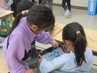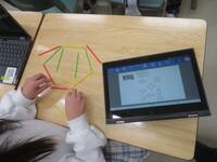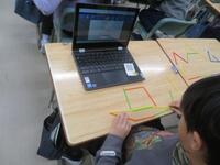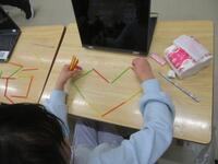 1年生の算数は、一年間の学習の終わりの方まできています。今は図形の学習を進めており、色板や数え棒を使って平面図形の構成や特徴について捉える活動をしています。今日は数え棒で、お手本の形を真似してみたり、自分で考えた形を作りタブレットで撮影したりしていました。タブレットの操作を子ども同士で教え合っていました。