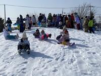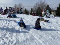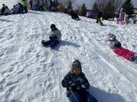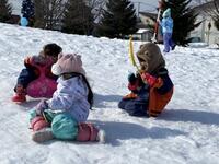 昨日からの暖気のため、雪山が少し小さくなっていましたが、子ども達は「そりが滑らない~」(雪の表面が固まるまでは滑りにくかったのです)とか、「いえ~い!」などと歓声をあげていました。何度も何度も登ったり滑ったりを繰り返し、全身で喜びを表現しながら滑っていることが、写真から伝わるでしょうか?