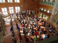 今日は、1年生と6年生にお披露目をしました。教室で先生から報せを受けていた子ども達が続々と多目的ホールに集まってきました。レリーフの下のボタンを押すと、リコーダー合奏の音色が聞こえ、それとともにレリーフの中の水車や飛行機のプロペラが回り出しました。見ている子ども達や先生方から「おお~っ」と、思わず歓声と拍手が上がりました。また一つ、学校の自慢が増えました!