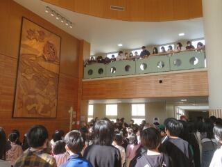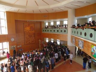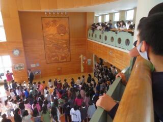 本校の多目的ホールに、開校当時作られた大きな木彫りのレリーフが2つあります。そのうちの1つは、ボタンを押すとメロディーが流れてくる仕掛けになっているのですが、しばらく故障していて鳴りませんでした。
