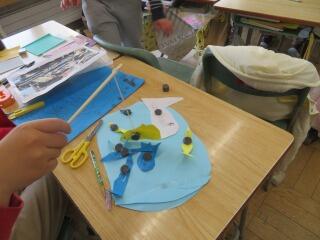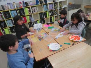 紙皿と筒の形をした空き箱などを使って、コロコロ転がるおもちゃを作りました。まずは、土台となる紙皿に筒をテープでつけました。そして、回した時にきれいに見えるよう、紙皿や筒に飾りつけをしています。ビーズやモール、紙テープなどを飾りに使いながら、糊やボンドを丁寧にぬって貼りつけました。それぞれ、自分のイメージを表現しようと集中して活動していました。