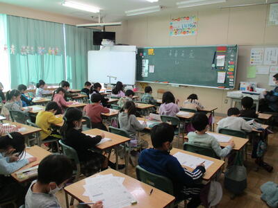 社会「まちの様子・ちとせの様子」、国語「つなぎ言葉を使おう」、図工「リコーダーを描く」の学習をしています。書く時間、話を聞く時間の切り替えがしっかりできています。