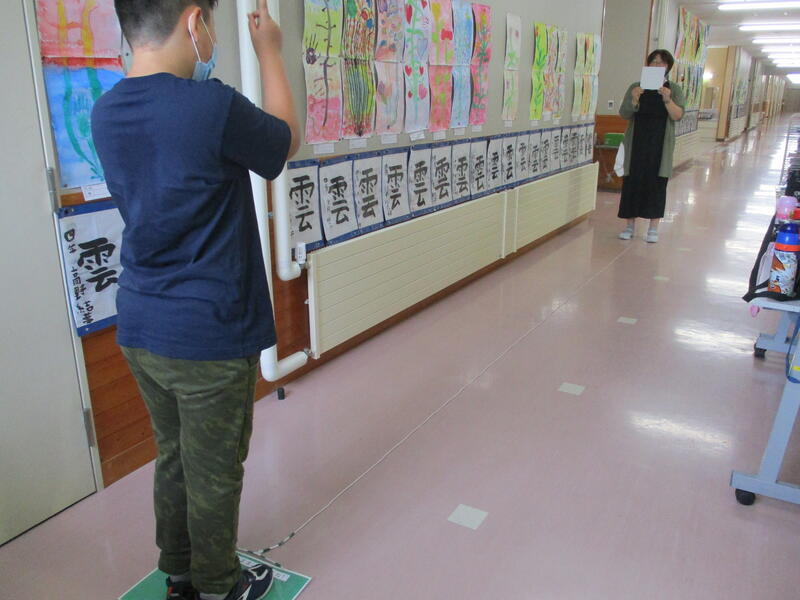 今週は4年生で視力検査がありました。よい姿勢で立ち、片目を手で覆い、5メートル離れて3回はかります。立ち姿勢がとてもいいですね。