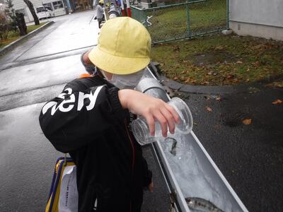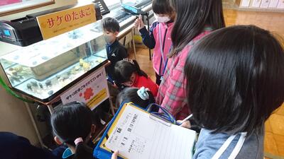 この3連休の間で3びきのサケの赤ちゃんがふ化しました。2年生がさっそく観察をしていました。
