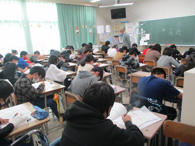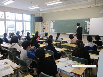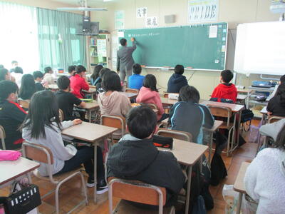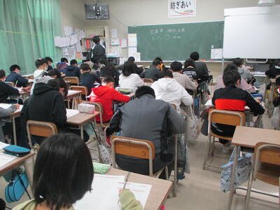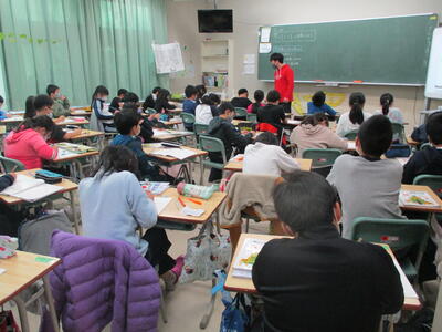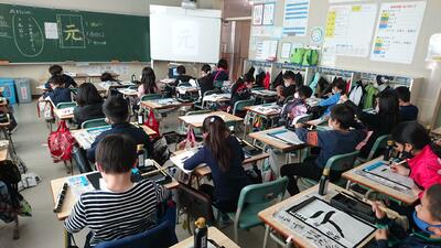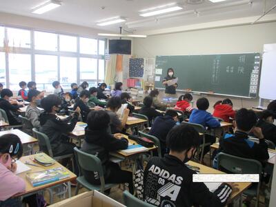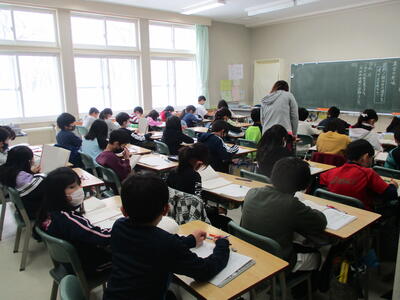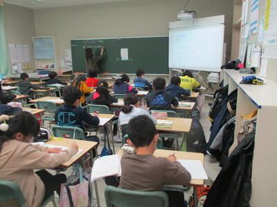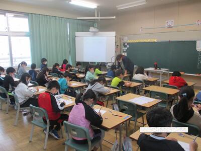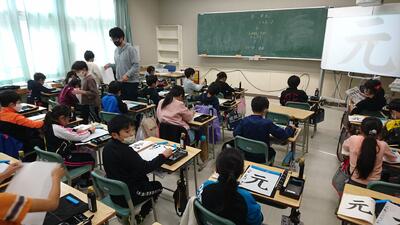 国語:漢字の書き順を学んでいます。聞く姿勢がとても立派ですね。
